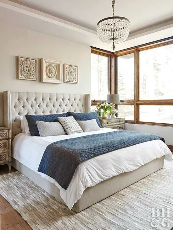 Art & Decor: Keep art and decor in the bedroom very simple. Think a small houseplant, a single book on the nightstand, a candle or two, etc. For the walls try mirrors or an abstract paintings in colors matching the rest of the decor, or have that be your pop of color if the rest of your room is neutral. Either way, personal photos are always a no no in the bedroom, and word art (signs that say Love, Family, Sweet Dreams, etc) is on the way out on the trends. I’ll also add area rugs in this section. If your bedroom doesn’t have carpet already, add an area rug to bring some softness and style to the room.