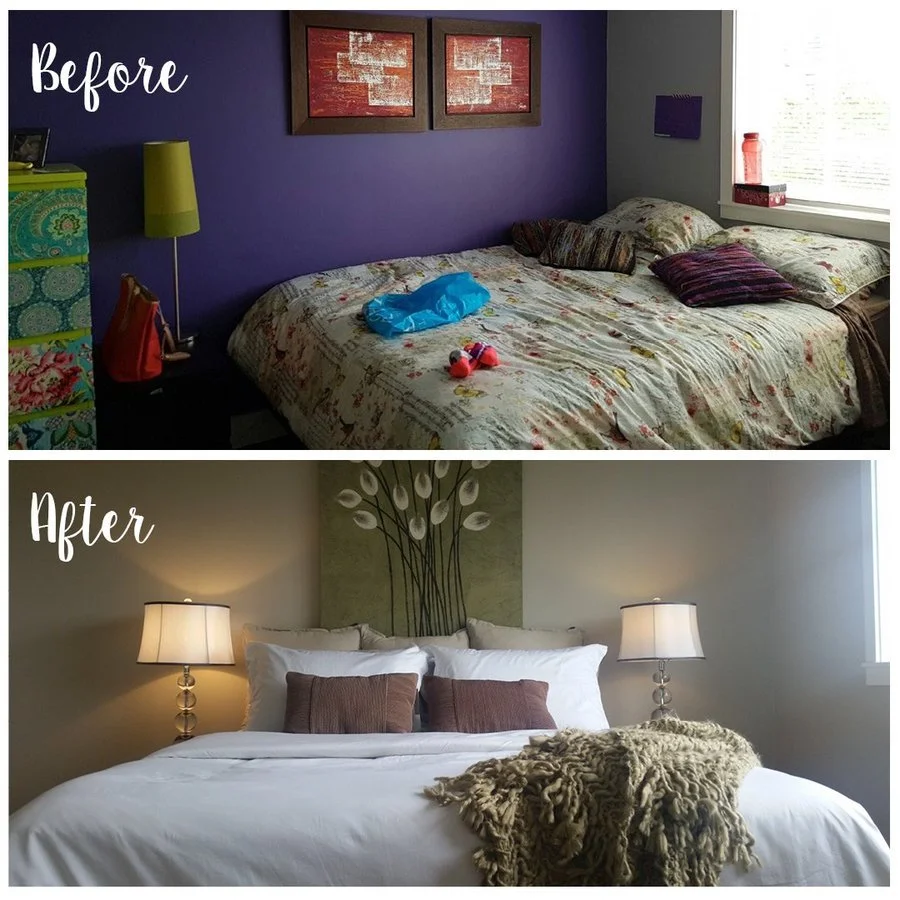 Clear the Clutter: Before diving into the staging process, decluttering is essential. Remove any unnecessary items, such as excessive furniture, personal belongings, or distracting decor. The goal is to create an uncluttered and spacious atmosphere that allows potential buyers to envision the room as a tranquil retreat. It’s hard to feel restful if there are so many distracting items in a space. Pick up clothing, clear off nightstands and dressers, etc. The only items that should be on top of surfaces are lamps and some simple decor.